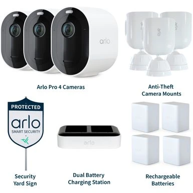 - Includes (3) Pro 4 Cameras, (4) Rechargeable Batteries, Dual Battery Charging Station, (3) Anti-Theft Mounts and Security Yard Sign.
